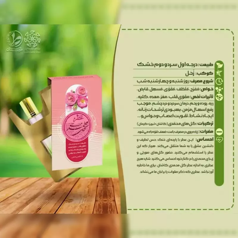غنچهٔ محمدی: چیدهشده در ساعات نخستین بامداد، با طبع گرمتر و بوی تیزتر؛ مناسب تحریک قوای مغزی و تمرکزی.