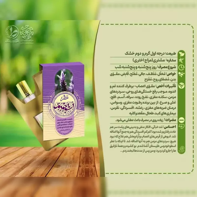 ❤️ احساس: تندخویی، افکار منفی و بدبینیهای پشتسرهم عادت رفتاریم شده بود! کمکم افسردگی هم به جمع آنها اضافه شد. انبوهی از قرصهای اعصاب و آرامبخش هم علاج که نبود هیچ، سردردهای مزمن هم به آنها اضافه شد. تا اینکه با عطر اسطوخودوس طیبستان آشنا شدم. بو کشیدم و همهٔ نارفیقها را جارو کرد و برد؛ و من پس از مدتها لبخند زدم ...